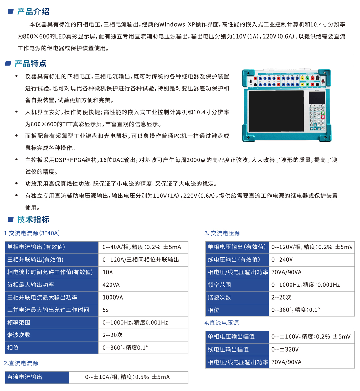 本儀器具有標準的四相電壓,三相電流輸出,經(jīng)典的Windows XP:操作界面,高性能的嵌入式工業(yè)控制計算機和10.4寸分辨率 為800×600的LED真彩顯示屏,配有獨立專用直流輔助電壓源輸出,輸出電壓分別為110V(1A),220V(0.6A)。以提供給需要直流 工作電源的繼電器或保護裝置使用。
