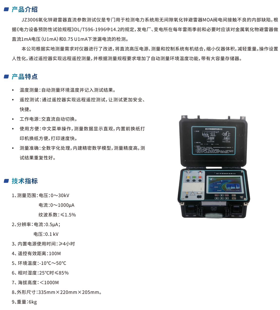 JZ3006氧化鋅避雷器直流參數(shù)測試儀是專門用于檢測電力系統(tǒng)用無間隙氧化鋅避雷器MOA閥電間接觸不良的內(nèi)部缺陷,根