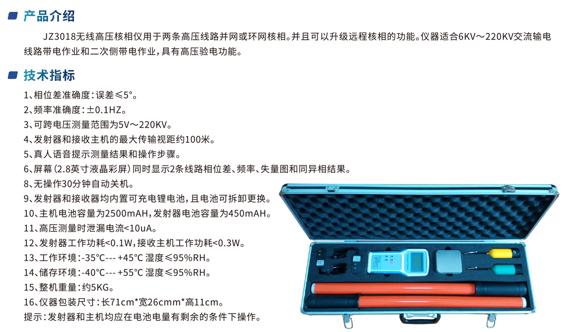 JZ3018無線高壓核相儀用于兩條高壓線路并網(wǎng)或環(huán)網(wǎng)核相。并且可以升級遠程核相的功能。儀器適合6KV~220KV交流輸電 線路帶電作業(yè)和二次側(cè)帶電作業(yè),具有高壓驗電功能。